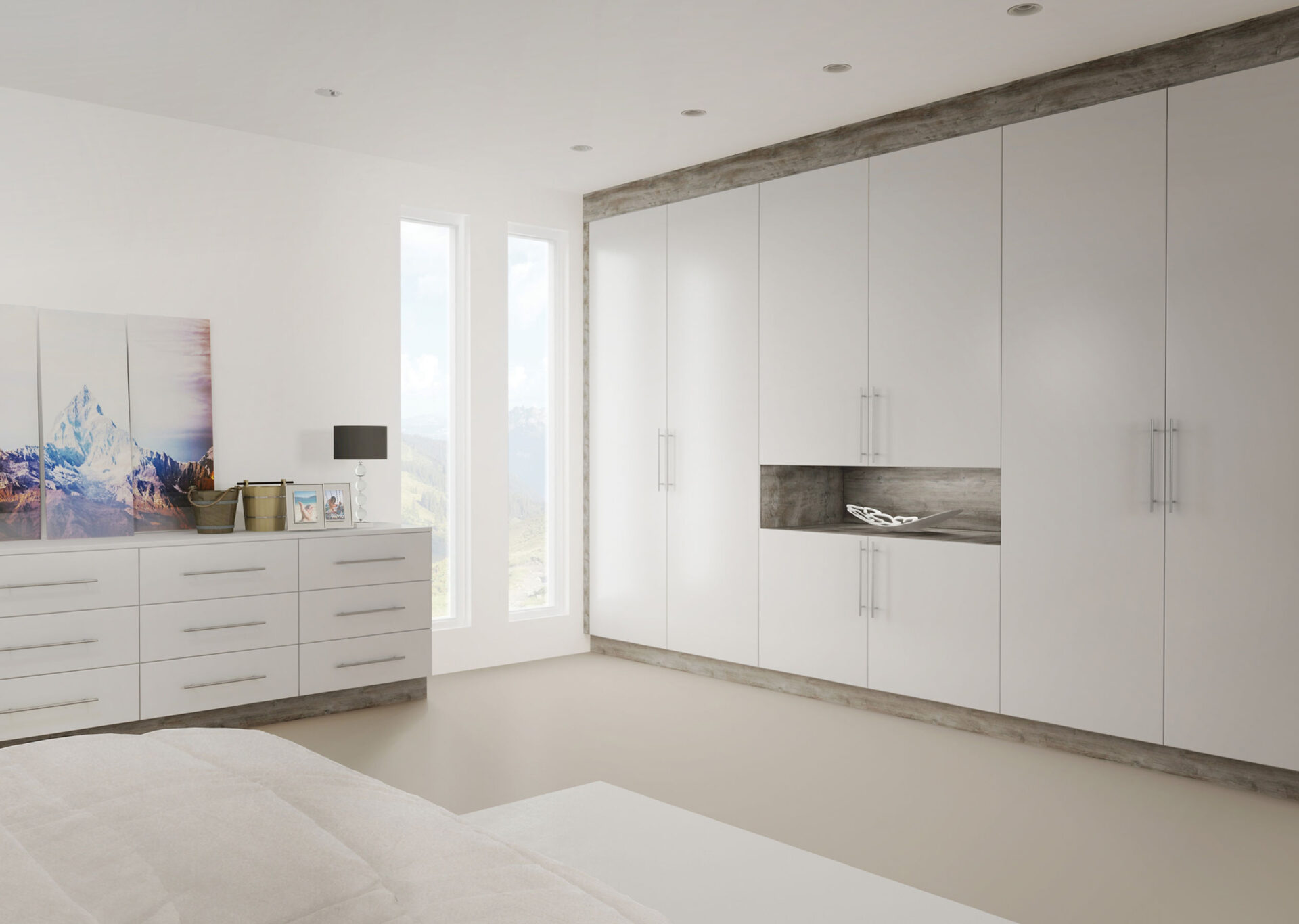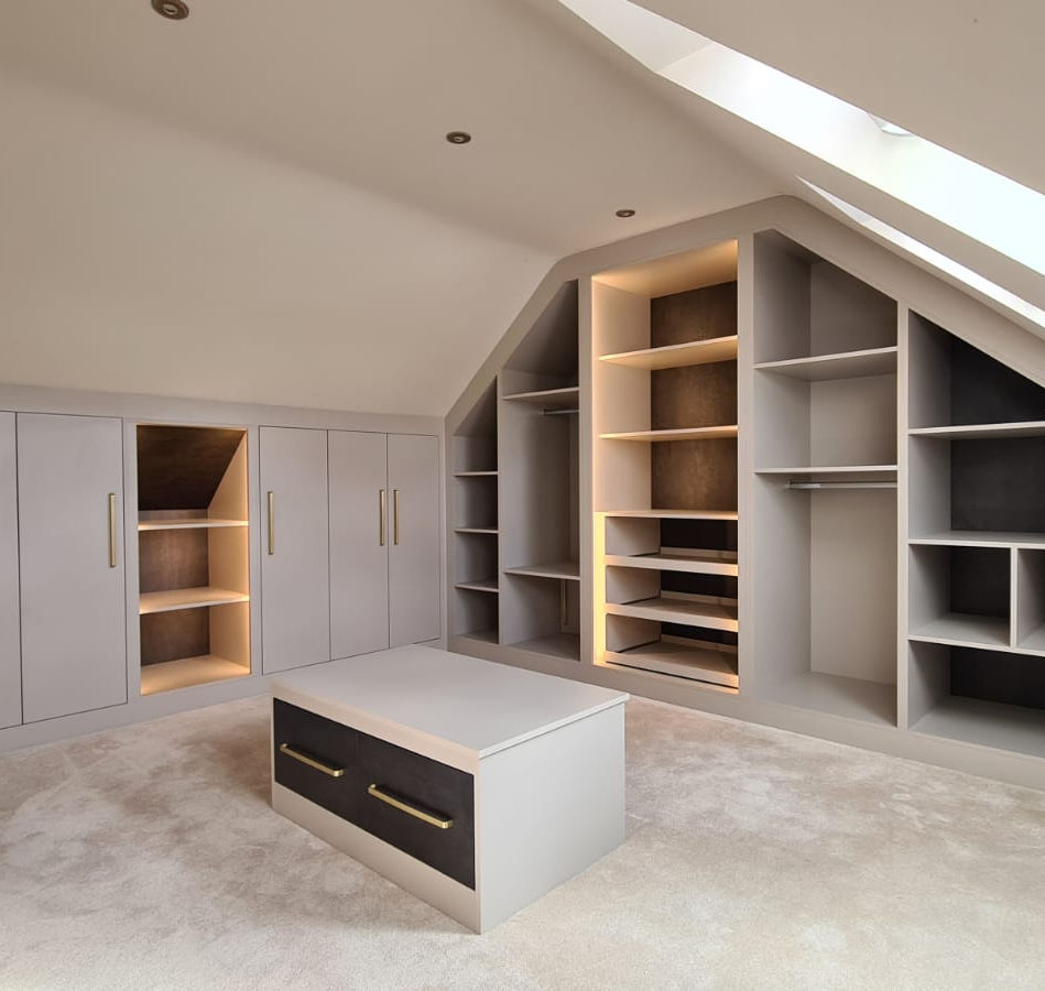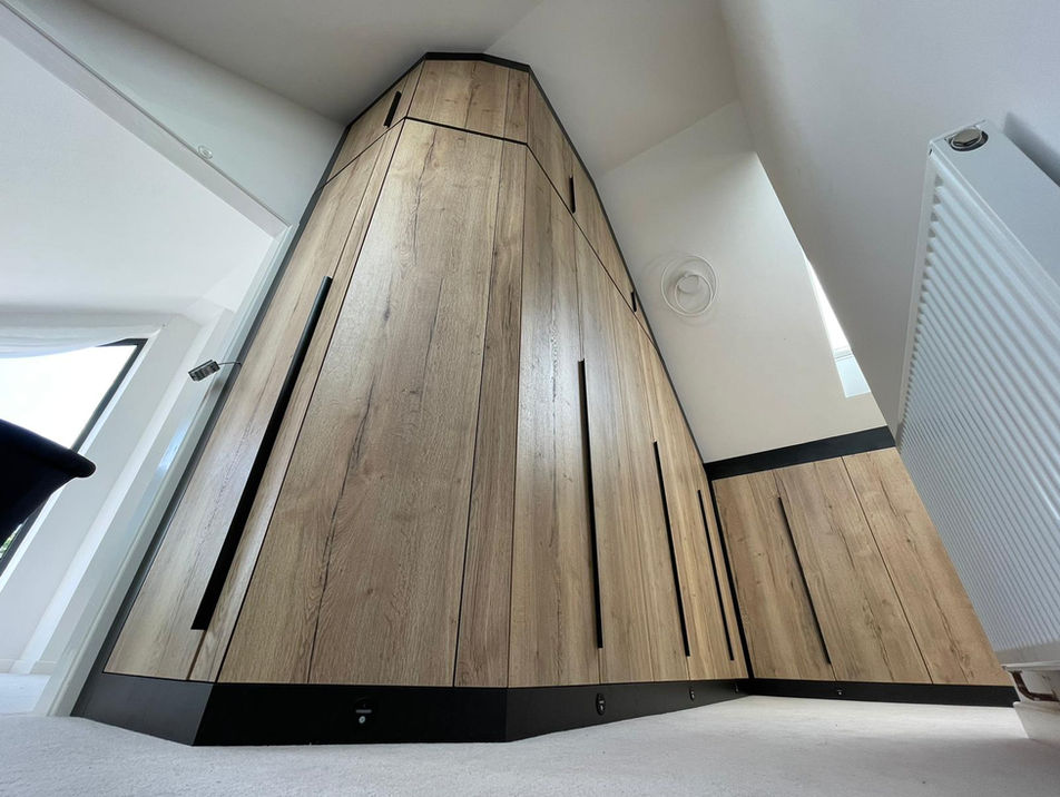 A: A built-in or fully fitted wardrobe is a piece of furniture that is made to the exact measurements of a space and maximises the whole area. The build will be scribed around skirting and coving by hand and gives a high end finish to any room.